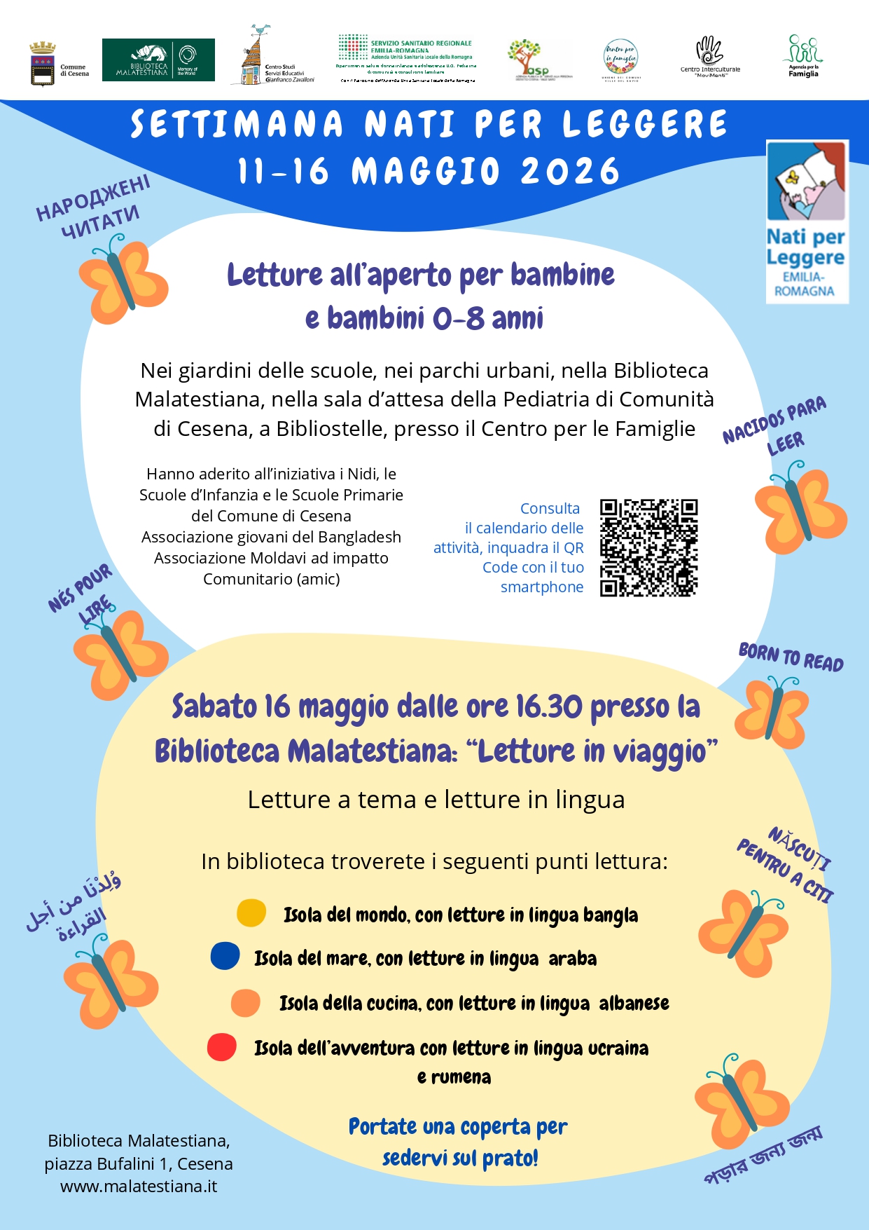 Settimana "NATI PER LEGGERE" Dal 11 al 16 maggio 2026, con giornata finale il 16 maggio 2026 presso la Biblioteca Malatestiana di Cesena. Documenti Settimana NPL 2026 (1)_page-0001.jpg Volantino Nati Per Leggere qr code settimana NPL 2026.png QR Code Nati Per Leggere